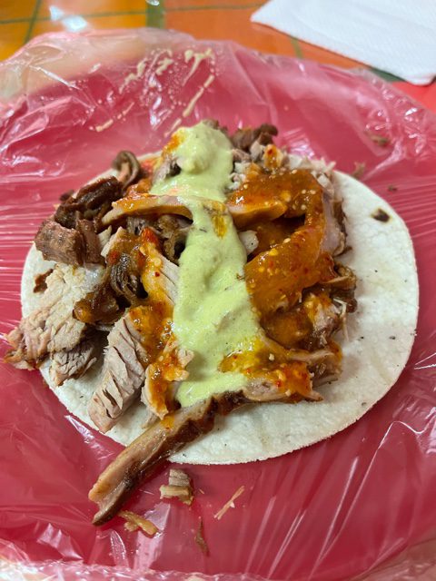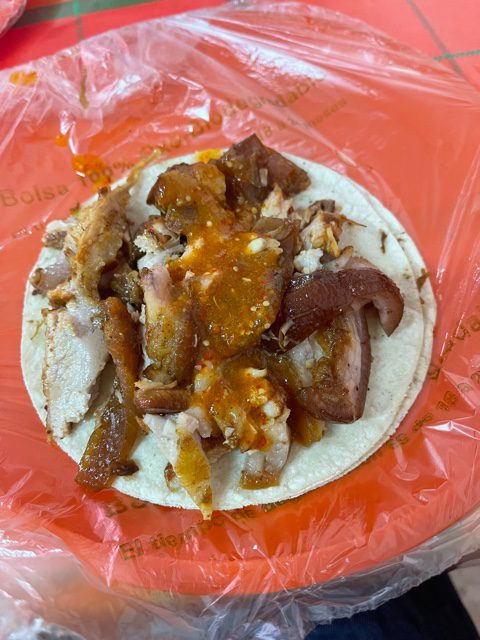 De inicio al formarte, ves que se estira la mano de un taquero hacia a ti y te ofrece un taco de cortesía así así, como de bienvenida y mientras esperas vas probando la delicia de estas carnitas. Este es con solo una tortilla y con un poco de carne al centro. Nada que ver con lo que está por venir.