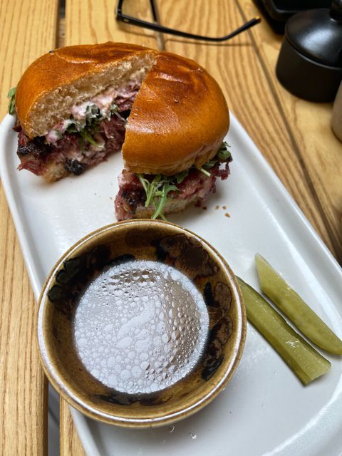 El último fue el que ambos le echamos el ojo al ver el menú, emparedado de roast beef $140 tan sencillo que se dice, tan sencillo que se prepara (claro ya rebanado el roast beef) y la gran maestría que se tiene para dejar en su punto esta deliciosa carne, que denota horas de cocimiento y dedicación. A diferencia de muchos otros lugares, aquí lo sirven en un pan brioche de hamburguesa, en el plato sólo presentan éste y un par de pepinos encurtidos, por ellos mismo claro, para acompañar. De side, ofrecen un poco de au jus, que este jugo de la cocción de la pieza entera de carne al que pesan por un cedazo para dejarlo lo más limpio y clarificado. Con él, vamos chopeando a cada mordida el sándwich para darle ese toque inolvidable.