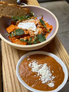De inicio y sin que sea comida, pude disfrutar este excelente café, su marca es: Estelar y ellos mismos lo tuestan hasta dejarlo en su punto. Regresemos a lo que nos ocupa pues. Iniciamos con unos buenos chilaquiles con salsa cremosa de chile morita $120 los ofrecen en un plato hondo, los totopos los presentan en pequeños cuadros con una salsa, diría yo un poco espesa, muy pegada a ellos, de un color naranja lleno de sabor, al que acompañan con unos brotes de berro, queso añejo espolvoreado y una buena porción de crema de rancho muy buena. A manera de side plate te traen un platito con frijoles, un poco enrojecidos con una buena porción de este rico queso. Están súper buenos, asi de mención honorífica y foto con el chamaco bien peinado.