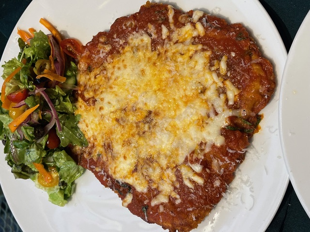 No podíamos dejar pasar un buen petto di pollo alla parmigiana $220 es una milanesa de pollo empanizada a la que una vez frita y crujiente, bañan con salsa de tomate y cubren con queso mozzarella para terminar en la salamandra o el josper (que es este horno de leña) dejando gratinado el platillo, con un terminado suave por arriba y un poco dorado por debajo, combinando ambas texturas y con la cremosidad que da el gratinado y la salsa, lo vuelven un platillo aromático y muy redondo en sus sabores que despierta. Se acompañó con una ensalada verde muy cumplidora con un aliño ligero.