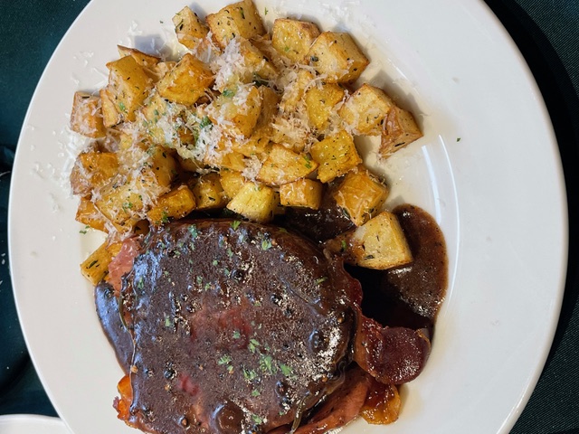 Seguimos felices con un filete de manzo avvolto nel prosciutto in salsa de chianti al pepe $460 así de gran nombre es el platillo de gran sabor, en una reducción de vino chianti, que es este vino tinto de la toscana italiana, con sabores predominantes a frutas rojas. Con un filete de 250 gr. muy suave a cuchillo, en boca la salsa es magnífica, llena de sabor. Envuelto en este prosciutto delgado, que con la cocción cambia su textura para dar una capa diferente al platillo. Lo acompañan con papas cubicadas, al romero con una buena espolvoreada de queso parmesano. Que cabe decir estaban deliciosas, firmes por fuera y suaves por dentro, con ese sabor característico del romero que combina tan bien con este tubérculo.