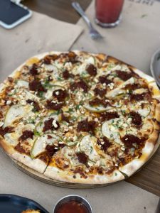 Seguimos con una pizza spicy lucas $219 de lo más original y con sabores que realzaban la calidad de los ingredientes a cada bocado. El pato, es adobado con chiles secos y tequila. Se cocina de desmenuza obteniendo un producto aromático de de gran sabor. De costra delgada y crujiente y un tamaño más bien mediano, la pizza es cocinada en horno de leña, que le da ese toque diferente y, además de la salsa de tomate, queso mozzarella y pato, lleva pera en rebanadas finas y cacahuates troceados, que le da una capa diferente de textura.