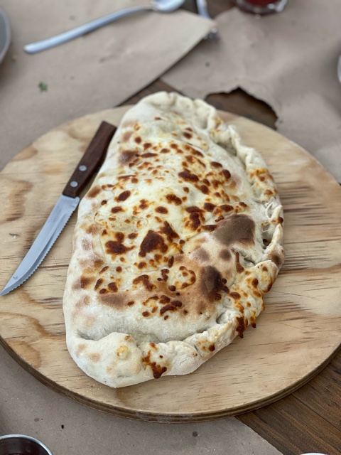 Seguimos en el tobogán cuando llegó un calzone #2 $189 como saben, el calzone es esta pizza cerrada, a manera de una gran empanada digamos. La preparan con hongo portobello en rodajas finas, cebolla morada, tomates deshidratados, selva negra y aceitunas. A diferencia de otros lugares, no llegó inflada como globo, lo que en mi pensar hace más difícil partirlo, era más bien algo compacta pero llena de ingredientes que al porcionarla, se puede sentir el sabor del queso, y todas las texturas que capa por capa hacen de este plato un festín de sabor.
