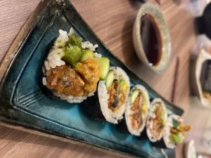 Nos llamó la atención, y ordenamos, un Jikko Maki (que también es futomaki) $327 es una receta propia, al menos eso me comentaron. Lleva anguila, tempura de cangrejo suave, pepino y espárrago y una mezcla agridulce de salsa de anguila y sriracha que le da un toque diferente y excepcional, tiene varias capas de texturas que vas encontrando y que es un disfrute al paladar.