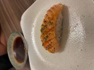 Por último, castigamos un nigiri de panza de salmón (salmon belly pues) $87 sin duda fue mi bocado favorito sin dejar sin mérito los platillos anteriores, y es que la sencillez siempre acaba ganando, el nigiri que se conforma de un puñito de arroz, apretado a mano y sobre él una proteína, que en esta caso fue un pedazo de panza de salmón, a la que pasaron el cuchillo, sin llegar al otro lado, para dejar una cuadrícula a la que recorrieron con la antorcha de cocina dejando una marca de doraditos y coronaron, al estilo salt bae, con un poco de sal de grano. En el primer bocado siente ese ahumado profundo que le da la quemada y un sabor inigualable de salmón y el tropiezo de sal. Con un arroz en su punto, se llevó las palmas y la noche.