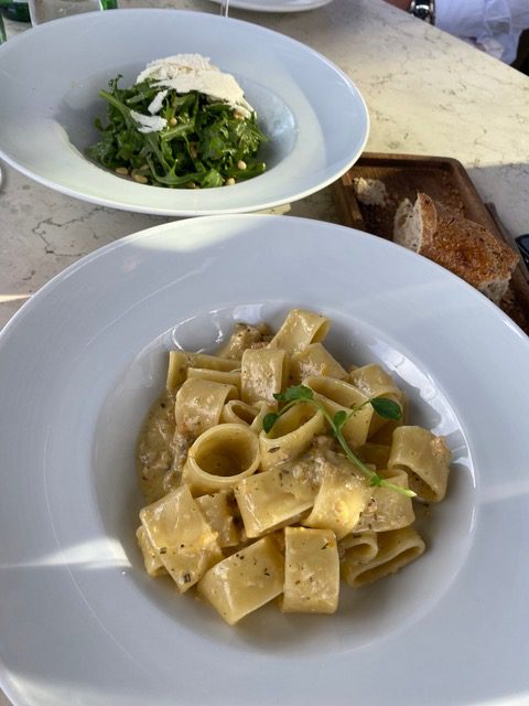 Por último, una pasta Calamarata con Ragú de mariscos $198 —que es esta pasta en forma de tubo ancho—, con un sabor verde-amarilla (porque al decir ragú uno la espera roja) con pequeños trozos de mariscos muy bien lograda y un balance ideal.