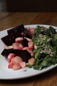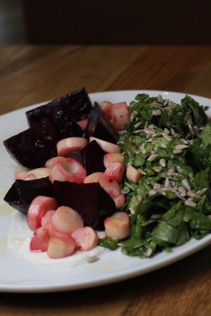 una combinación de berro, betabel, vinagre balsámico, palmito y semillas de