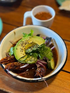 Iniciamos con una tostada de aguachile zarandeado $55 la presentan en platito hondo rebosado en su salsa, como para que tu te la prepares, de esta manera tu tostada siempre esta crujiente y es mas fácil compartir. Su zarandeado lo elaboran con 7 chiles y deja una salsa muy rica en sabor, se siente el adobo y un dejo cítrico muy marcado. Sus camarones (3) los presentan en corte mariposa, acompañan con unas lajas de aguacate y cebolla en corte pluma y hojas de cilantro. Una entrada magnífica con un sabor digno de pregonar.