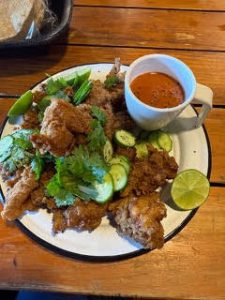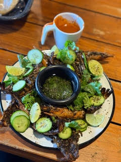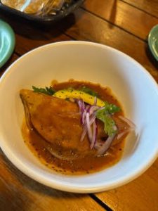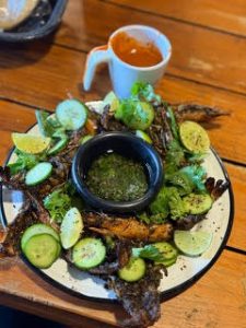 Para no dejar a la solitaria con hambre, por último, disfrutamos unos camarones chamusca2 $140 estos los preparan enteros, en corte mariposa, con ceniza de habanero que tateman hasta dejar ennegrecido totalmente, ya que el fin último es que te sepan a humo, logrando así un sabor sinigual. Los presentan en plato trinche y con una salsita al centro a base de tipo macha con perejil, ajo y sal ahumada. Lo acompañan con rodajas de limón, pepino persa y cilantro. Una nueva experiencia gastronómica para disfrutar.