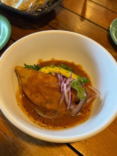 Seguimos con el espíritu compartidor con un chicharrón de tiburón $130 éste lo preparan con pescado basa, que es uno de los mas sencillos. Muy bien rebozado y frito hasta dejar muy crujiente. Lo presentan en plato trinche de peltre, acompañado con unas rodajas de pepino persa, limón y una tasita con su salsa maestra que es excepcional y muy rica a base de salsa ponzu con un poco de tabasco, haciéndola cítrica, pero picosa pero adictiva pero dulce. Muy bien lograda y de excelente sabor.