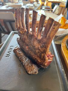 Barra Barbera $1.31 / gr. te llevan a tu mesa una mesita con algunos de los cortes mas tradicionales de la casa. entre ellos sobresale un gran pedazo de carne, como de unos dos y medio kilos, una carne muy limpia y con algo de marmoleo que se asomaba por uno de sus extremos, ahí tu puedes pedir donde decidir el tamaño de elección y el mesero, frente a ti, lo corta, te pide el término de tu preferencia y se lo llevan a parrillar y lo devuelven con la cocción solicitada y lo cortan y ponen en una plancha caliente donde, puedes mantenerlo caliente y darle un último toque a tu gusto. Tienen varios acompañamientos, nosotros nos inclinamos por puré de camote que tenía la humedad exacta y no sentí que se hayan pasado con la mantequilla, que es lo normalmente pasa. y unas papas que sirven en una pequeña cazuelita de hierro.