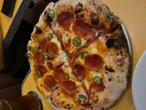 Como siempre, se compartieron 3 platillos al centro. Iniciamos con una Pizza piquete de abeja $180 es mas bien de tamaño personal, no familiar. La presentan cortada en cuartos que llegan a ser grandes. Nos inclinamos por ésta, por su descripción; es de pepperoni, con miel de abeja que ha sido infusionada con habanero y unas rodajas de serrano. Tiene un picor medio, pero nada que no permita enamorarte e irte a ojos cerrados. El sabor es realmente bueno, esa combinación dulce / salado no tiene madre. Su masa delgada con un mix quesos ganador; cheddar blanco y mozzarella.