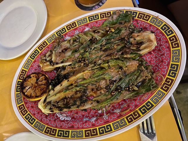 Por último, llegó un bok choy $125 que es este vegetal muy parecido a la lechuga y muy común en Asia. Normalmente se le llama la col asiática, pero para mí es más bien; una lechuga asiática. Es alargada, vienen 3 mitades y las ponen al grill a sellar, marcar (y darle ese sabor a quemado) y suavizar que es lo importante. Les añaden una salsa a base de cacahuate con salsa macha, limón amarillo asado, mismo que tu exprimes a tu gusto en mesa, y un poco de salsa de pescado. Con un sabor exquisito, suave y profundo. Gran plato para compartir.